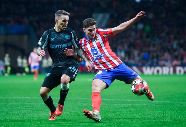 马竞本轮2比1击败勒沃库森队,掌握直接晋级16强的主动权。这是阿根廷前锋阿尔瓦雷斯(右)在比赛中射门。图片来源:新华社